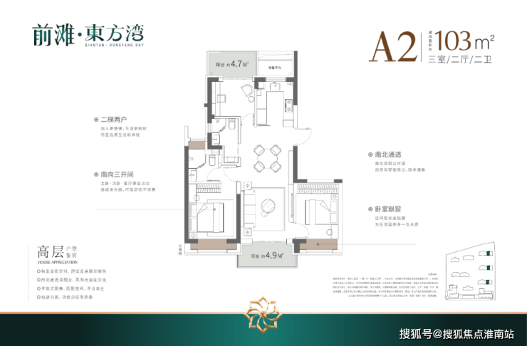 户型建筑层高3.1-3.15米,无连廊,双阳台配置。其中建面约103平户型2梯2户,其余一梯一户。
