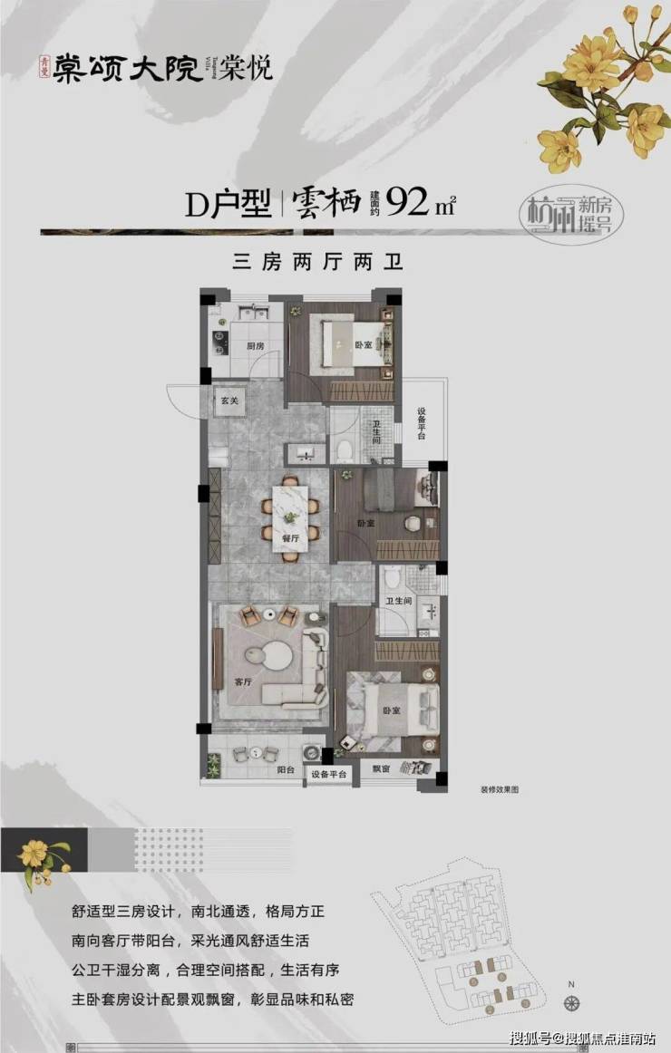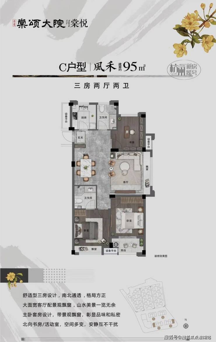 舒适型三房设计,南北通透,格局方正,大面宽客厅配景观飘窗,山水美景一览无余