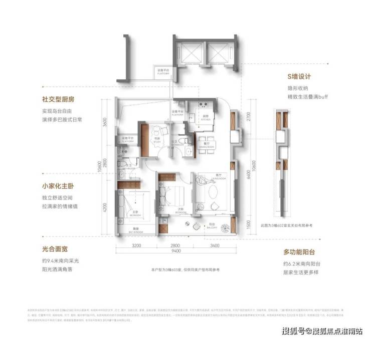 户型方正,没什么浪费面积,虽然是中间套设计,但做到了全明户型,通风效果好;南向三开间,双联阳台+飘窗,南向采光充足,阳光满堂;超配S墙,隐藏收纳柜,让小家越住越大,可以说杭州少见。