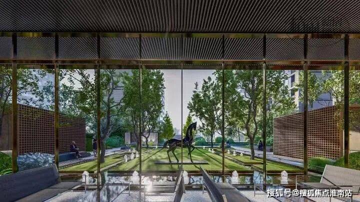 汲取四季酒店设计精髓,于社区主入口打造豪华酒店大堂式归家设计,以迎宾落客区--会 所式大堂--摩尔会客厅的渐进式排布,勾勒出入境--入画--归影的三重归家仪制。落客区采用酒店泊湾式环岛,尊崇与仪式融贯一体;会 所式大堂融入“会客厅”理念,空间纵深开阔,给予业主更多的舒适便利;摩尔会客厅叠石翠景,两侧灵动水系映泉满堂,一步一景,各有天地。