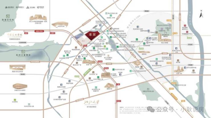 核心卖点:城西科创走廊东起点,紧邻紫金港科技城;2字头精装限价盘,四大房企(建杭/招商/滨江/绿城)联合开发;四面铝板公建化立面,配蓝宝石中央泳池;户型得房率超80%,125㎡户型实现四开间朝南+13米采光面