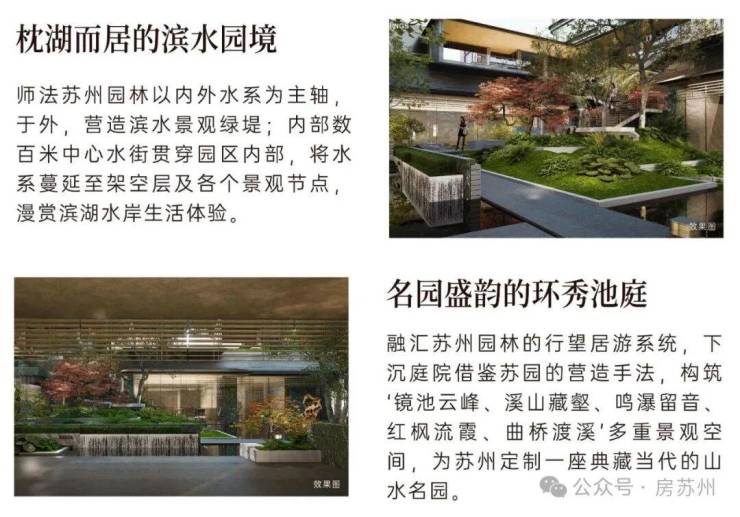依凭半岛三面水岸的天然资源,以“一堤三面湖”和“水街襟两园”设计笔触,实现滨水互动、开门见水的场景体验;融汇吴门画派、苏州园林造园理念,营造出一座温润如玉的流动庭园。