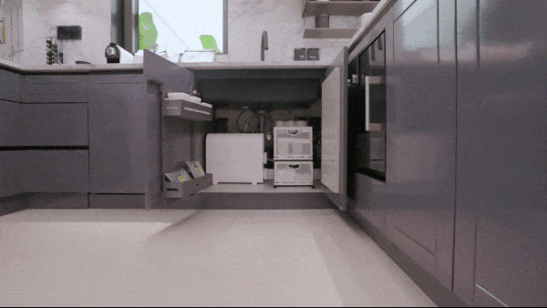 收纳系统依托博洛尼整体橱柜,利用转角空间、钻石台面及下拉式拉篮等设计,配合可按压开柜、反光镜等巧思,大幅提升空间利用率与取物便利性。厨房装修采用E0级环保板材与抗菌岩板,从源头杜绝污染,确保耐用易清洁。