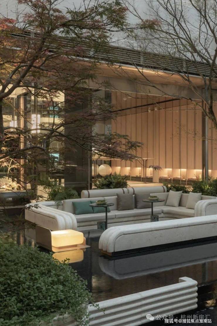 中央水景仿佛运河的一滴水直接滴入了社区,石材打造的基座像是溅起的涟漪,会把廊柱的影子与运河的波光揉碎,又慢慢复原。两侧镜水面如一块巨大的翡翠,倒映着天光云影与回廊倩影,让时光都变得缓慢。