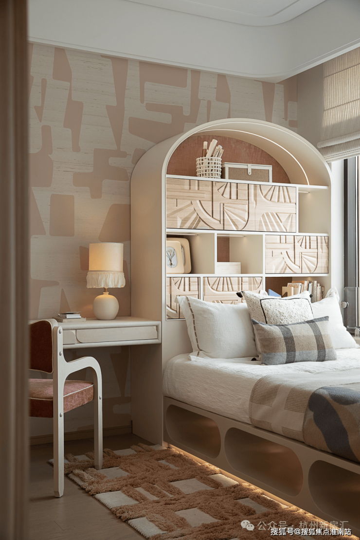 女孩房以粉白色为调,营造童趣唯美的成长天地。床体与收纳柜一体设计,弧形顶柜兼具收纳与装饰功能。飘窗,成为安顿身心的精神角落。展卷小憩或凭窗静思,皆可于熟悉的日常中,抵达诗意栖居的真意。