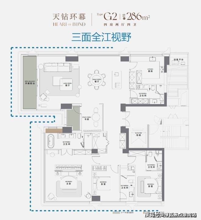 2)286㎡户型:三面看江“全景舱”,它是澐启滨江的定价天花板之一