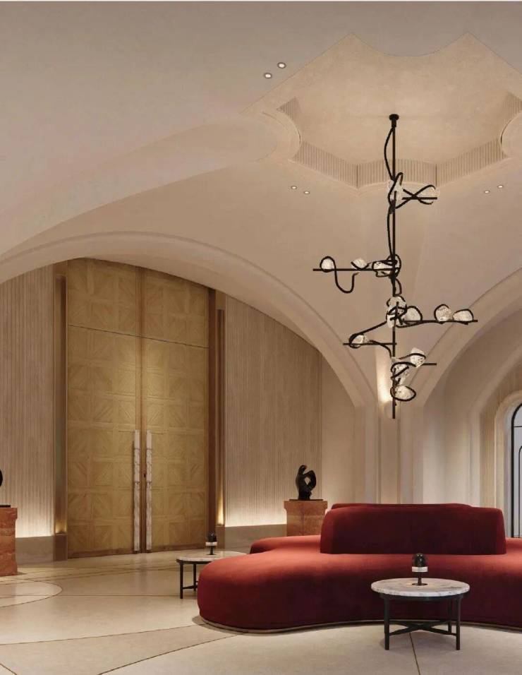 大堂位于主入口。米白色调为主,中辅以温暖红橘色调,拱形吊顶、铁艺花门和拼贴机理大理石地面交织复古与现代。枝形吊灯散发出艺术光芒,红洞石装置与室外红砖立面遥相呼应。复古橘色非围合沙发洋溢着温情,四向座席无主次之分望向室内或花园,四向皆景。