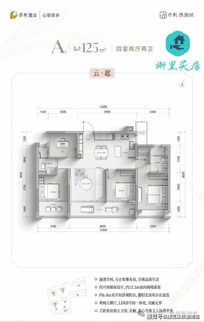 四开间朝南设计,约13.3m南向阔境面宽