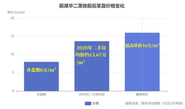 前滩某盘开盘时均价约8万/㎡,华二前滩学校落地后,二手房在2020年涨至约13.67万/㎡,最高单价达到16万/㎡。即使在市场冷静期,前滩多数小区仍保持价格坚挺。