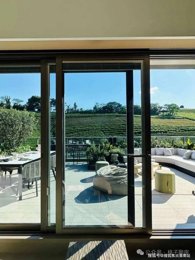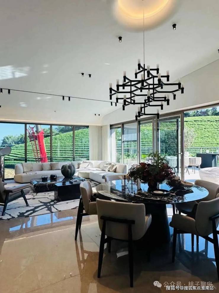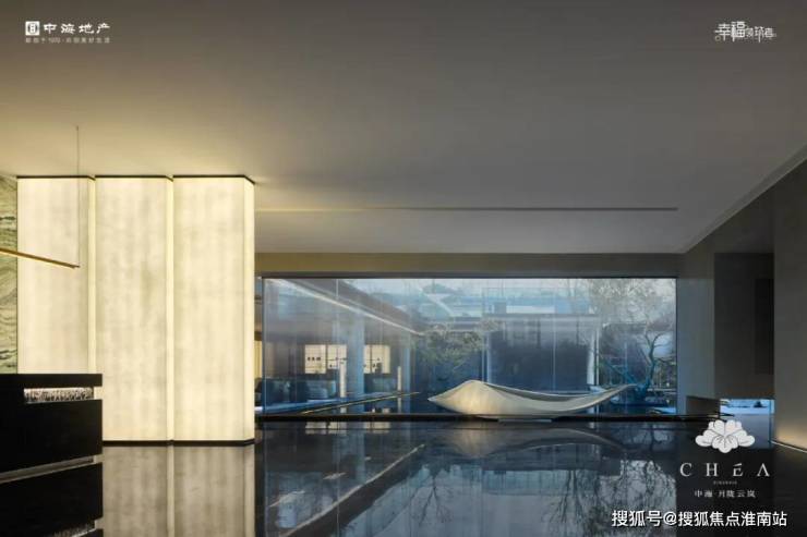这座水庭也是一整面「水镜」,将中心的乌桕树、周围的超大白玻、精致的艺术雕塑都倒映其中。