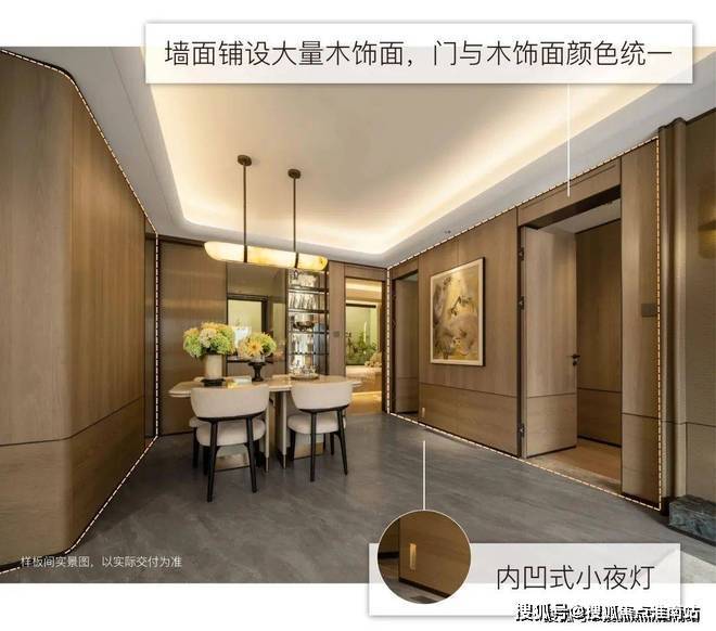 江湾金茂府售楼处电话:400-8818-994(官方统一售楼处电话4008818994)项目墙面木饰面刻意设计上下纹理差异,并镶嵌金属线条,在视觉碰撞中营造立体层次。