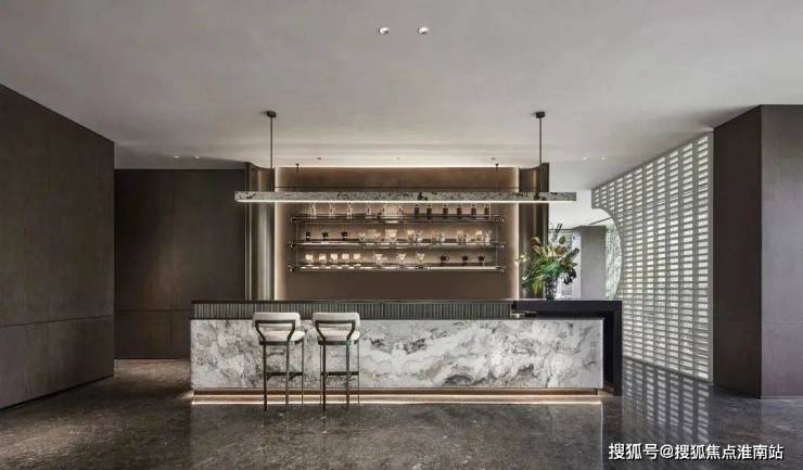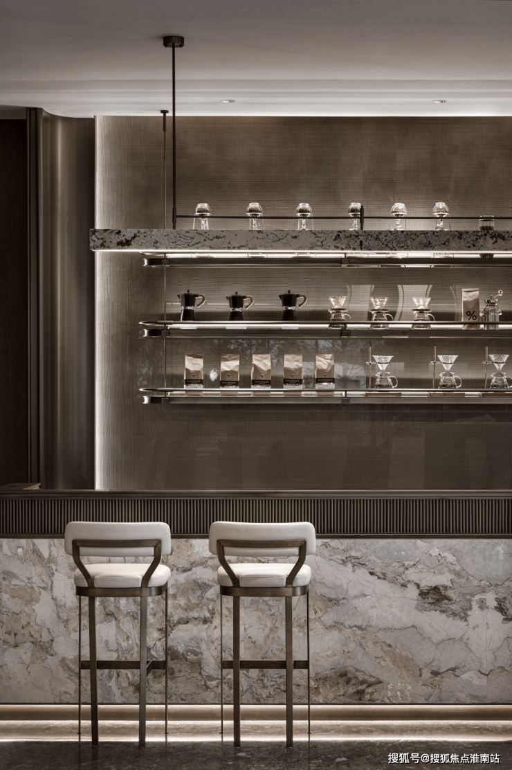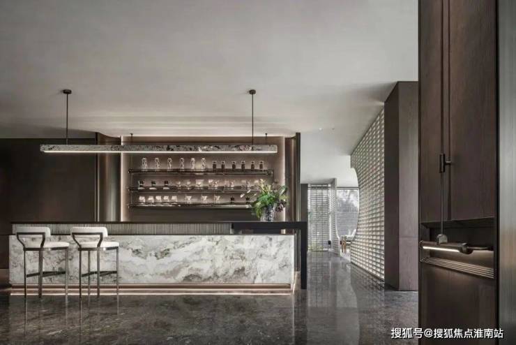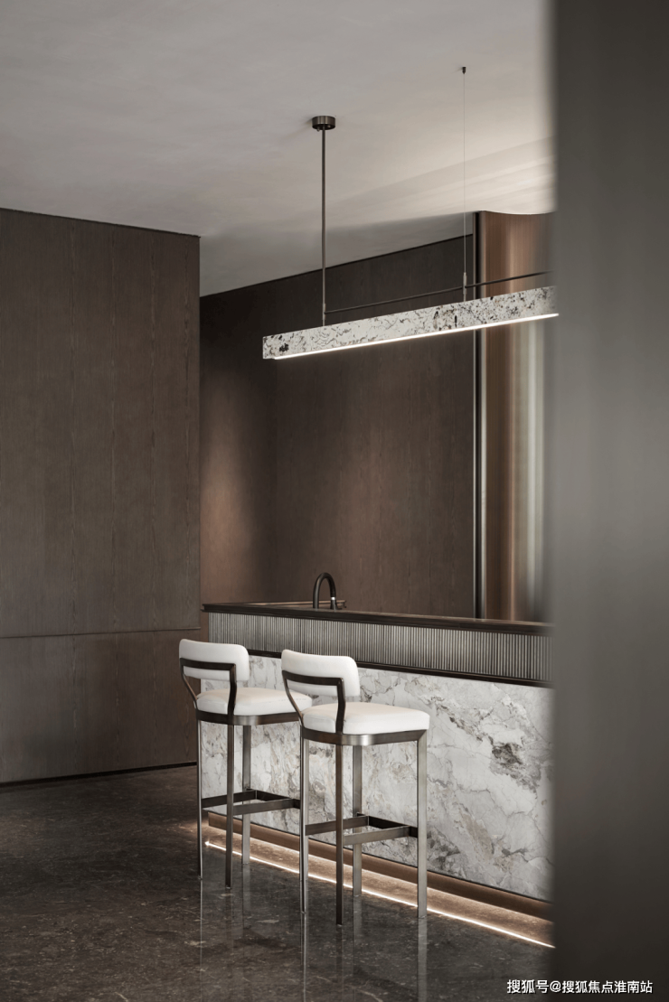 天然理石纹理犹如山间潺潺的溪水,在吧台蔓延开来。散发着夕阳余晖的金