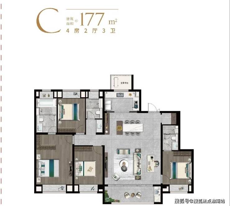 以约177㎡户型为例,约6.3m的大尺度阳台与公区深度融合,LDKG一体设计衍生出的多情境组合得以提供更多情绪价值。