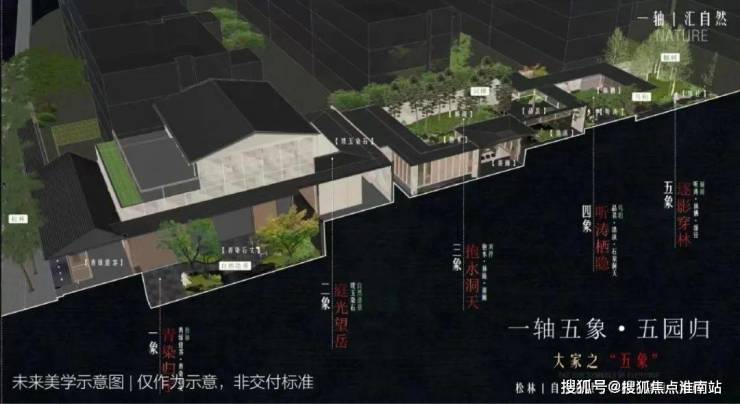 东方奢雅立体五感庭院:1轴+5园+6 巷+12景,打造东方避世、都市静居、与自然共栖的生活道场。