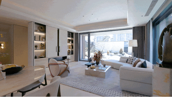 南向约9.3米超大面宽,搭配约3.3米的朗阔层高,营造出恢宏通透的空间尺度感。客厅与南向阳台完全打通,延伸出一片融于自然的阳光厅堂,推窗即见私家庭院,实现室内外场景的自由切换,演绎真正的墅居生活意境。