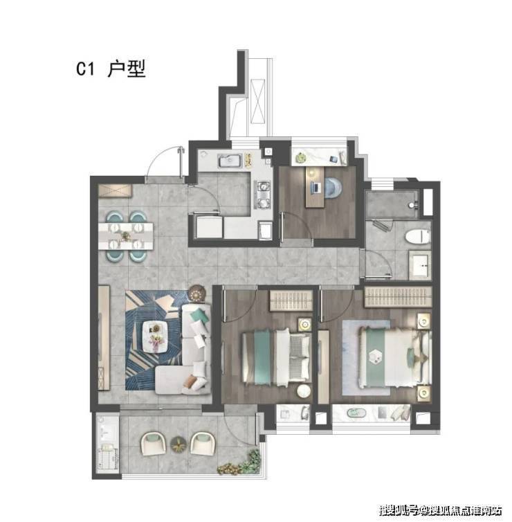 高层99㎡三房两厅两卫(中间套)样板间户型