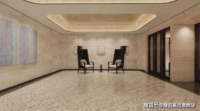 大堂前厅有别于大部分地库的设计,做了酒店式的体验。全石材的地面,顶上是一块艺术漆,周边陈列着青年艺术家的定制画作,打造艺术展览般的场景体验,业主们可以在这里放松心情,欣赏艺术,静下心来感受这处与外界不同的艺术空间。