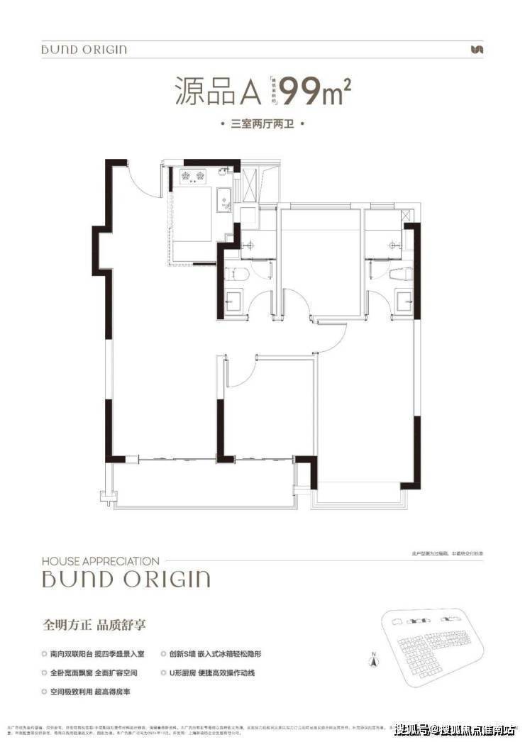 上海杨浦外滩源著复兴里售楼处电话☎:400-9966-224(预约看房热线)建面约99㎡3房2厅2卫,非常标准的动静分离、三开间朝南户型.