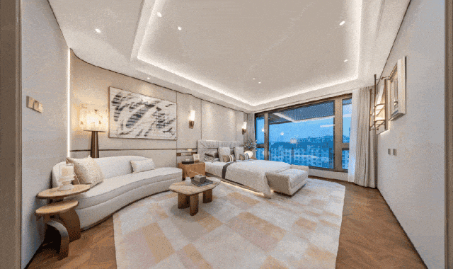 阳台交付时统一系统封窗,地板、吊顶全通铺,让室内视野与采光无限延伸;