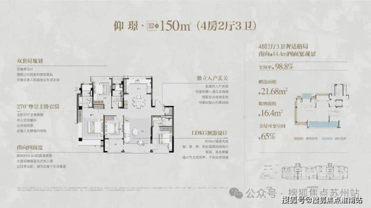 建发·璟园洋房的建面约150㎡户型,可以轻松实现四开间朝南+双套房设计,南向约14.4米四面宽观景,直追其他项目180㎡的人居尺度。