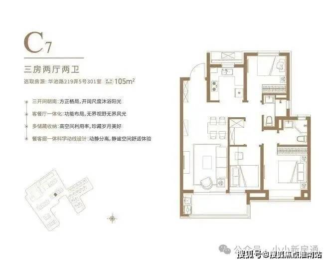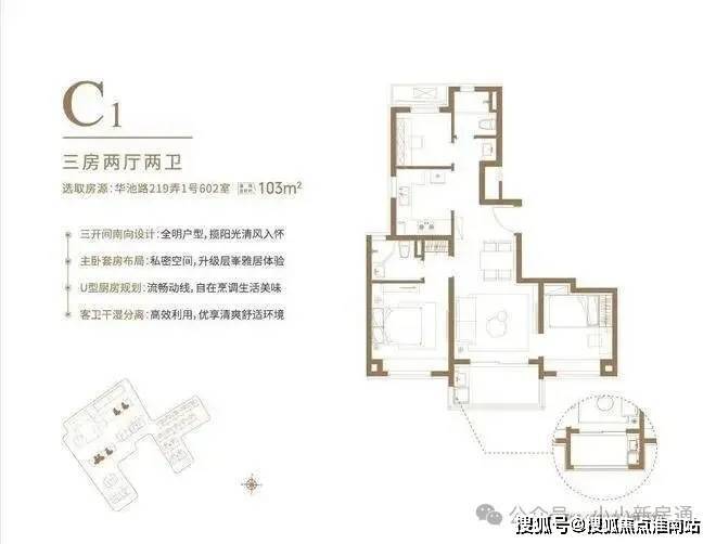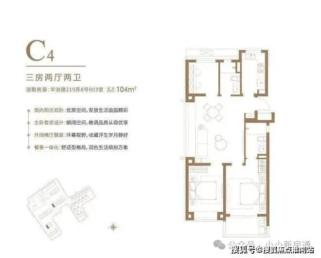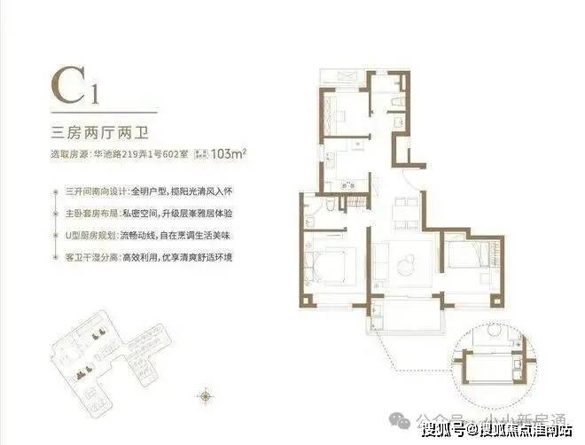 户型设计灵动,目前开放了104㎡3房2厅2卫和103㎡3房2厅2卫样板间,可谓是各有看点: