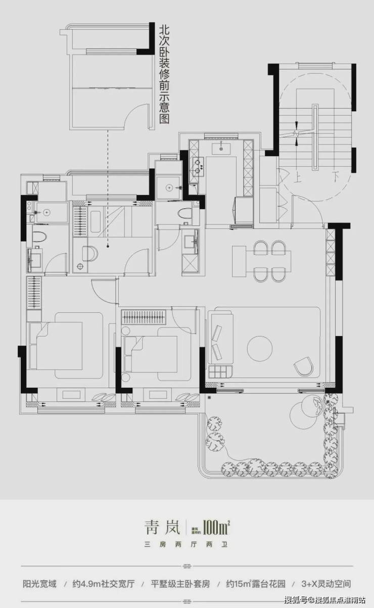 青岚户型 建筑面积约100㎡ 三房两厅两卫阳光宽域|约4.9m社交宽厅|平墅级主卧套房|约15㎡露台花园|3+X灵动空间