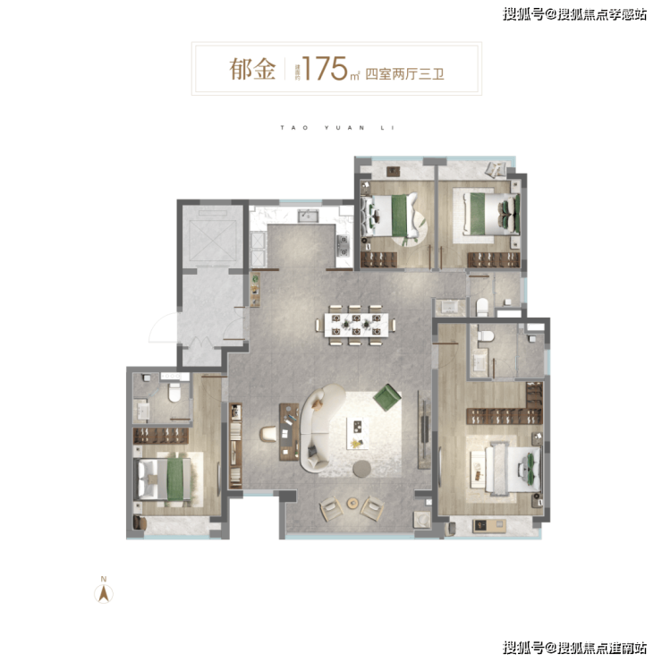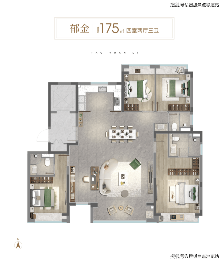 建筑面积约165㎡户型样板间,打造南向4.5开间,即在4开间的基础上,通过设计手法将餐厅、客厅、厨房、阳台融为一体,让传统竖厅的通透格局同时具备横厅的宽广空间。