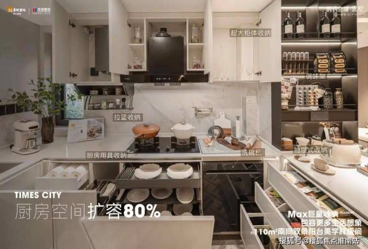 其全屋收纳系统尤为突出!U型厨房采用半开放式设计,“分层调味架、下拉篮及踢脚抽”实现高效收纳;