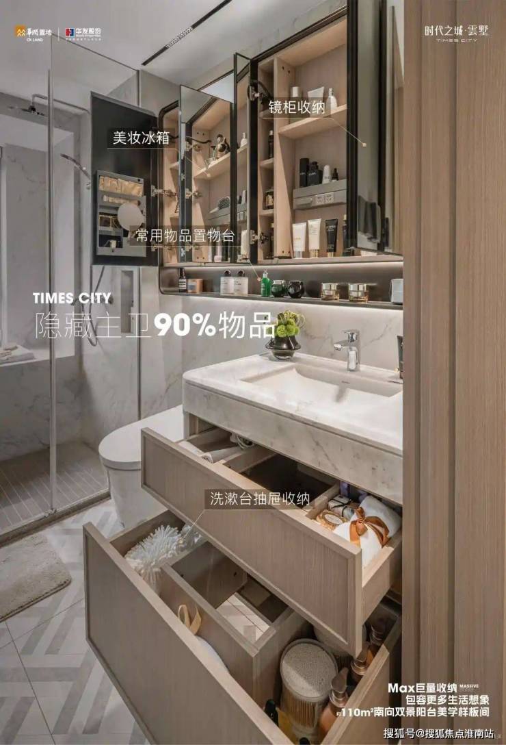 卫生间的收纳更是创新!双卫配置大容量镜柜并增设置物台提升实用性;公卫通体收纳柜,细枝末节的杂物均可一并容纳!