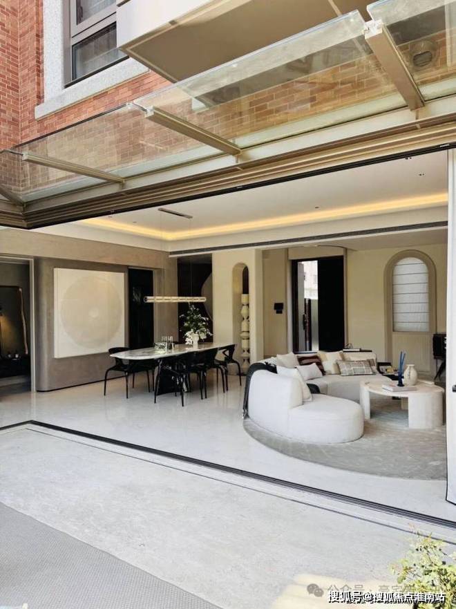 「无界空间」:客厅270度转角无柱设计,搭配落地玻璃,开阔视野将院中风景迎入日常。