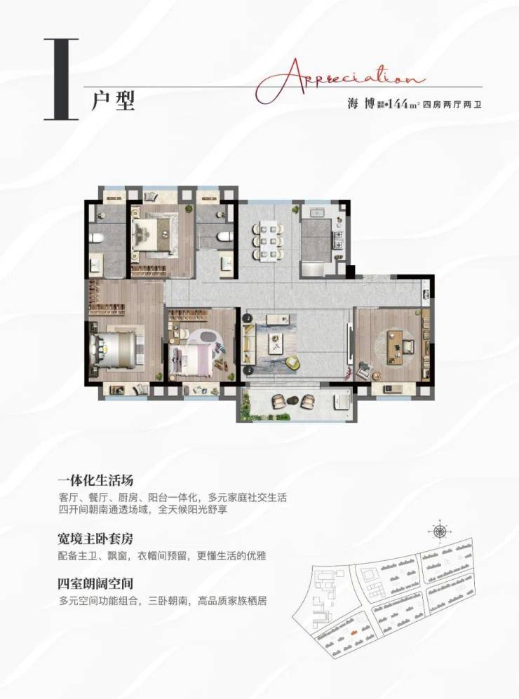 四开间朝南大面宽,采光充沛;大横厅搭配宽景阳台,从容容纳二胎家庭、三代同堂生活;餐客厅进深合理、南北通透,通风采光俱佳。