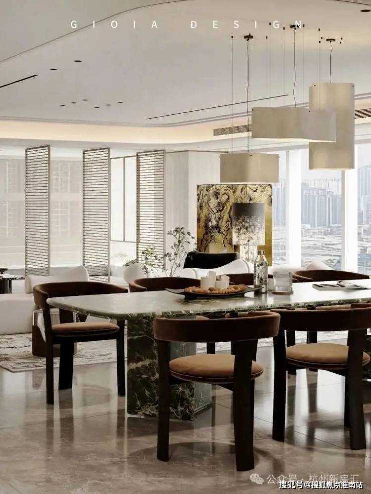 将艺术感进一步融入日常中。特别设计的专属门厅空间,是从电梯厅延伸到家,如同一处艺廊,放慢人的情绪;室内选用了浅金色奢石(外界也称其为“芬迪白大理石”)作为主要的石材,曲面的木饰面也为浅色,整体给人以明亮感。