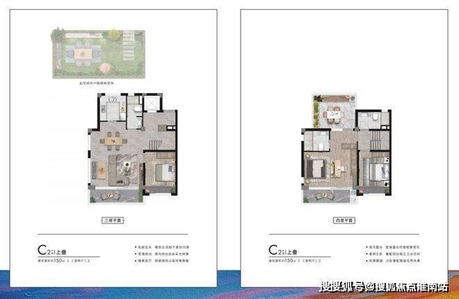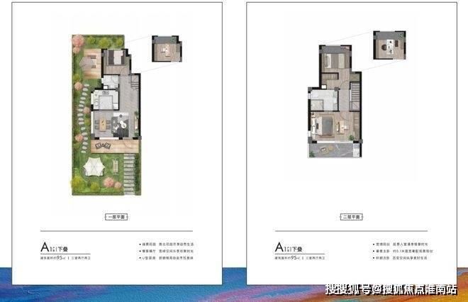 来看户型,面积段有两种——建面约95㎡下叠、上叠;建面约150㎡下叠、上叠