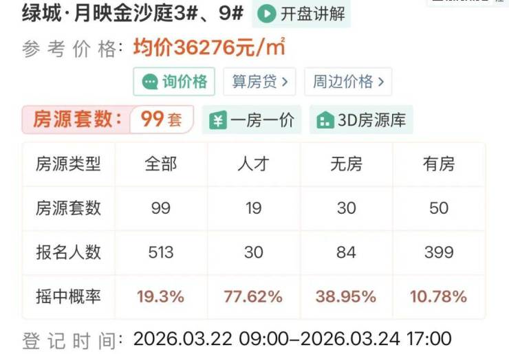 ● 三开燃爆:99套房源引513组疯抢,有房中签率10.78%,创板块历史新低!