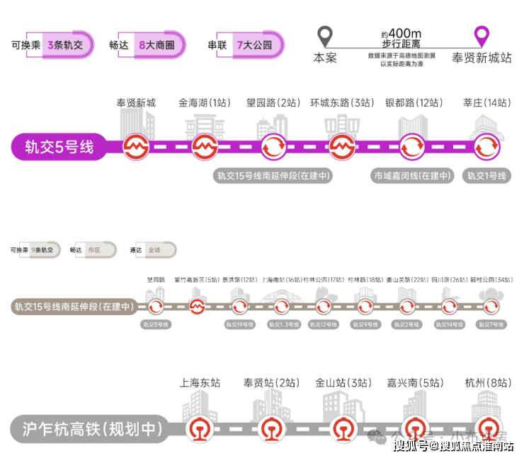 交通方面:项目多轨交环绕,5号线、15号线南延伸段(在建中)、市域嘉闵线南延伸段(规划中)、沪乍杭高铁(规划中)及南枫线(在建中)