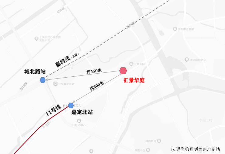 直线距离约600米范围内分布了2个地铁站点!并可分别触达11号线及嘉闵线(在建中)。