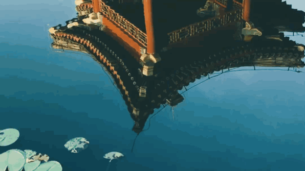 池中水面倒映着阁楼台榭的影子,仙鹤悠然,与水中天光云影虚实对应,颇有一番藏月入谷之情韵。