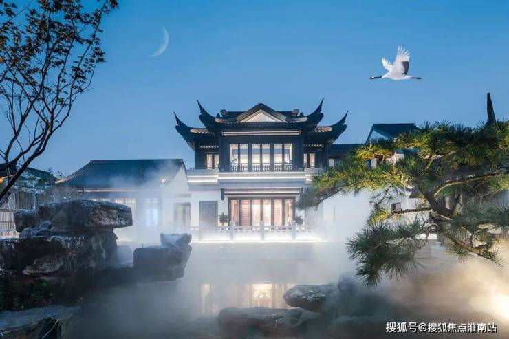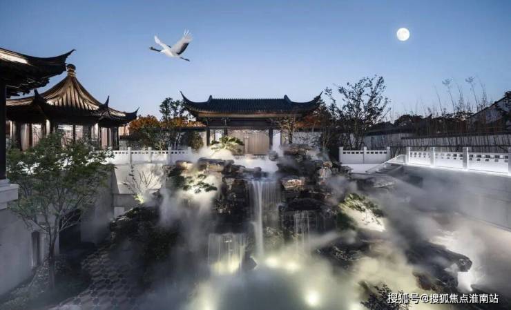 步入「与山」门之后,映入眼帘的是一座下沉式庭院,庭院下沉,原本平底阁楼,如今显得高耸入云, 曲水倾泻而下,凌空之势,让人有“江流天地外” 的美感,叠石理水,亦有“山色有中无”的意境。池中水面倒映着阁楼台榭的影子,仙鹤悠然,与水中天光云影虚实对应,颇有一番藏月入谷之情韵。