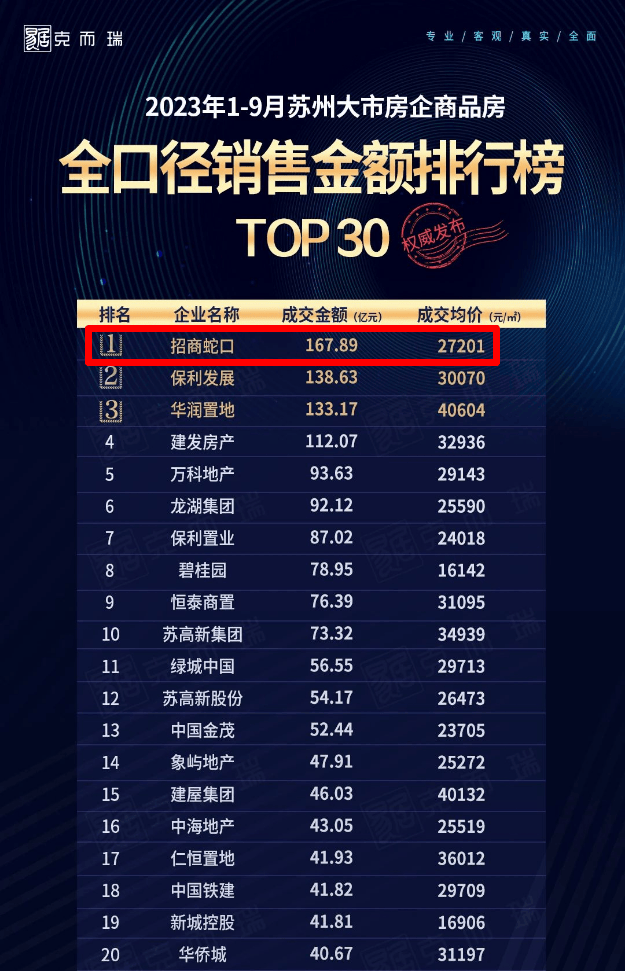 招商蛇口,是央企综合实力排名第一的招商局集团下属旗舰企业,招商蛇口苏州公司连续三载蝉联苏州大市房企销售金额TOP1!2023年1-9月苏州全口径销售金额&面积榜单双双拔得头筹!