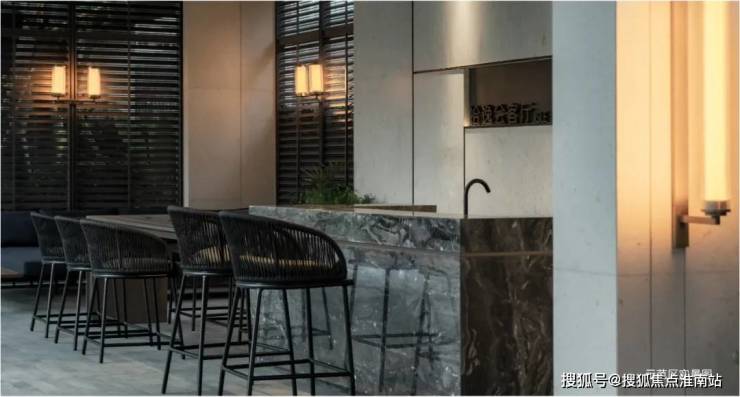 绿荫包裹的中心廊架,一处半围合的会客空间,以玛丽安娜奢石搭配厚重的木纹质感格栅,塑造出更懂昆山的在地感美学主场——富有质感的吧台、柔软舒适的沙发,以及无线充电等贴心配置,让业主可以在此品茗、插花、对弈、社交……未来,也可在这里开展万科植物园等社群活动。