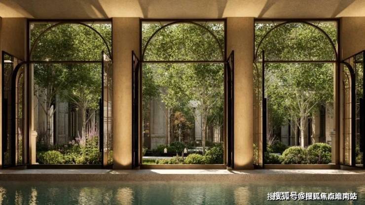NO.8花园泳池波光潋滟处,拱形门窗外花影摇曳,一池春水将四季芳菲溶成流动的油画。