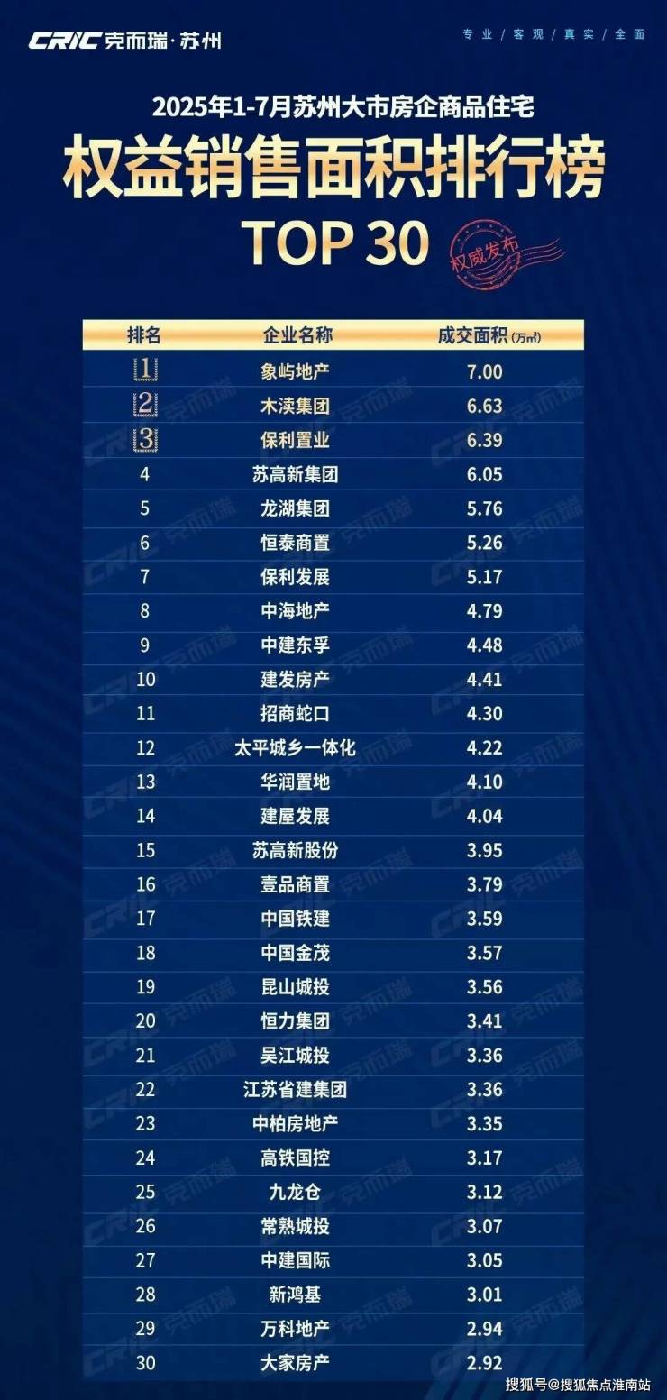 克而瑞权威数据显示, 2025年1-7月象屿地产在苏州大市房企商品住宅销售中,权益销售面积排名第一。