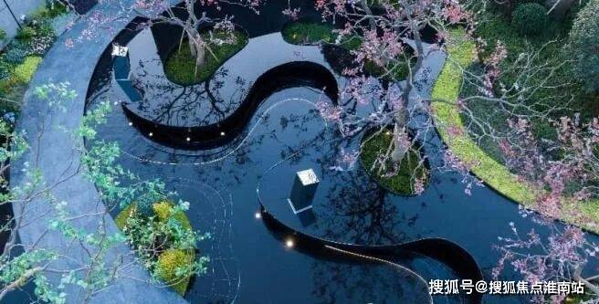 此外, 「门檐灰」以灰色石材搭配铝板线条,让社区大门在绿植映衬下尽显质感,承载着归家的从容仪式; 「奢石黑」铺就弧形艺术园林水池,夜晚灯光亮起,黑石如墨色绸缎,与水波光影交织出静谧禅意;