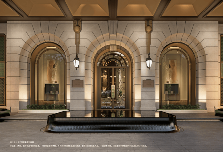 高层与洋房承袭外滩经典建筑的“横纵三段式”结构,由下至上的力量感,树立起极具辨识度的优雅姿态。别墅则甄取华盛里石库门的过街楼、老虎窗、立面腰线等元素,以大面积石材与金属细节点缀,实现历史符号的当代奢华表达。