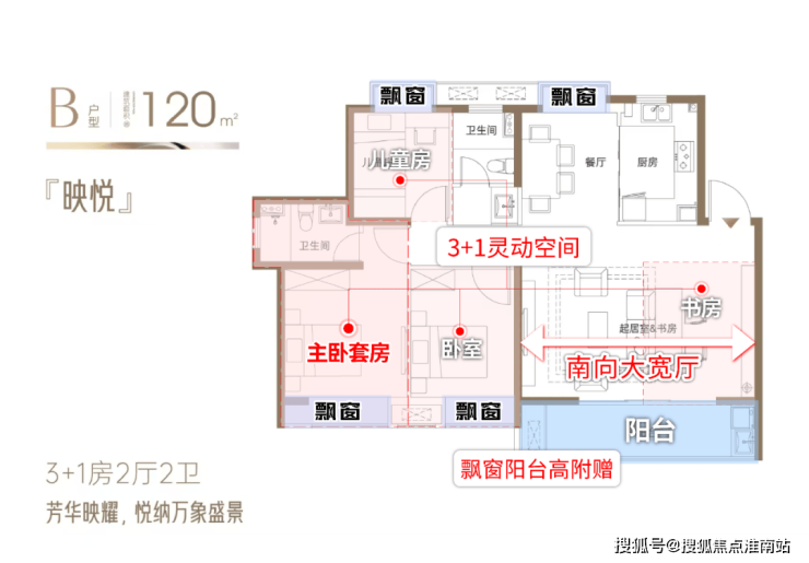 『映悦』约120㎡3+1房2厅2卫:「四面宽朝南+IMAX巨幕阳台」把四季风光框成生活背景,横厅联动开放式书房,办公、社交、亲子时光自由切换;3+1灵动空间随家庭成长变形,二孩时代或三代同堂都能从容适配。
