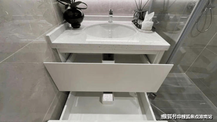 卫生间洗手池下的空间向来是卫生死角,还有弯曲的水管绕来绕去。项目却别出心裁地将这个死角做成了储物柜,充分利用空间。