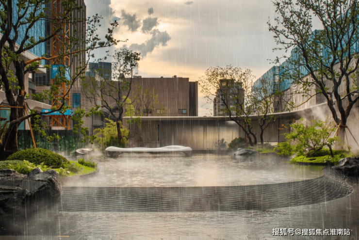 浮光池院水院会客厅,现已实景呈现,水景中央的艺术小品,如一滴水在湖面晕开,泛起阵阵涟漪。