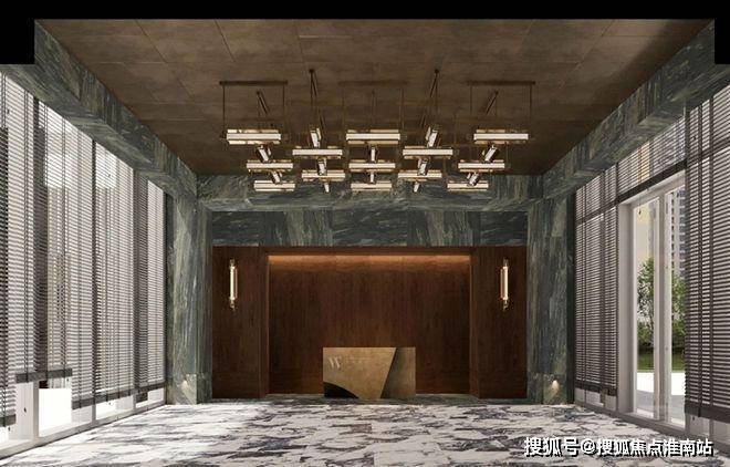 项目采用地上+地下三层同标准精装入户大堂,一楼大堂层高约6.6米,大堂选用有着媲美艺术品表现力的亚马逊绿天然奢石,结合仿古铜不锈钢、艺术壁灯为点缀,将上海的摩登气息注入归家大堂,给业主更强烈的入户仪式感。