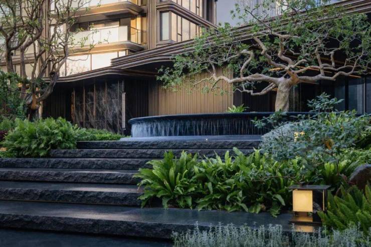 自【悬浮茶室】拾级而上,在【思韵书院】外,一处闲憩放空的【阅川水岸】至此呈现,脚下溪流自脚下蜿蜒而过;眼前,是幻影蓝奢石池底的幽邃微光。一株来自地中海的油橄榄,与一棵百年老桩紫薇在此相望。