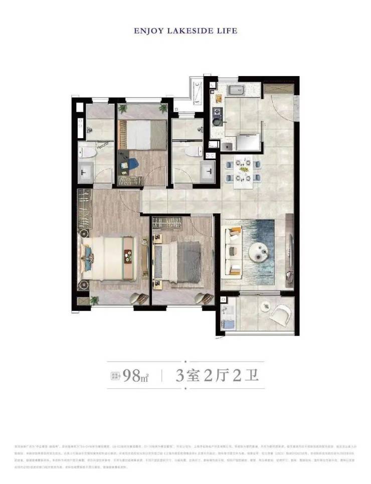 建面约98㎡三房两厅两卫(全明格局,双卫设计)